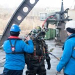 Auch bei Kälte und Schneetreiben bereiten VERBUND-Taucher die Turbinen-Inspektion beim Donaukraftwerk vor.